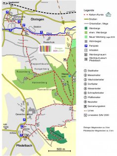 Ab hier zurück auf dem Nußbaumweg nach Öhringen (oder weiter auf dem Pfedelbacher Rundweg). Die „Pfaffenkelter“ (7) stand rechts im Baumgrundstück. Alternativ gelangt man zum Standort der „Schnepfenkelter“ (6) (beim „kleinem See“) auf dem Parallelweg. Links Richtung Hundeplatz, Standort der „Neukelter“ (8) an der Wegkreuzung, geradeaus nach ca. 150 m sind die alten Weinbergmauern, Weinbergtreppen und ein alter Kellereingang zu sehen. Zurück zur Wegkreuzung und weiter auf dem Rundwanderweg durch den Tunnel bei der Platanenallee, Röntgenstraße, Albert-Schweitzer-Straße, Freiherr-von-Stein-Straße, Hungerfeldstraße, bis zum Nußbaumweg, rechts in die Hunnenstraße und auf dem Kelternweg zurück bis zur Stadtmitte.